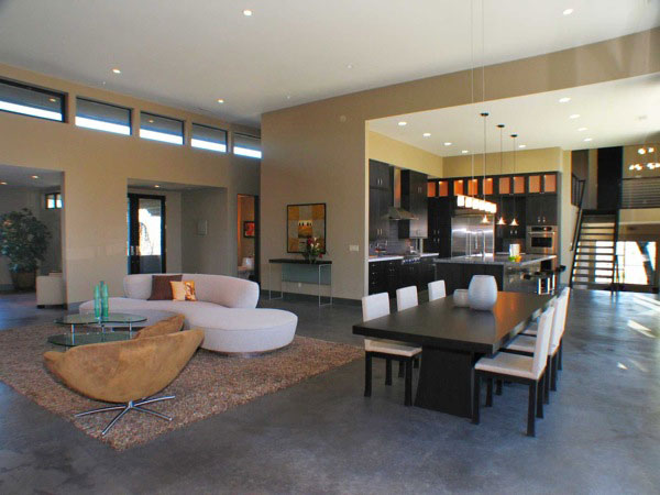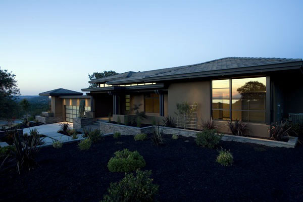 The design of this house is a direct response to practices that we saw prevalent in the residential construction in El Dorado Hills in the early 2000s. During the construction boom, many builders took substantial shortcuts by treating design and material selection as secondary to expediency in construction. For example, many floor plans in the area included wasteful square footage by placing bedrooms on the second floor with long hallways. This house has virtually no hallways or wasted circulation square footage within the entire plan. A typical house uses up to 15% of the square footage for circulation alone, which amounts to a roughly 700 square foot bonus in this house. As well, the windows are expanded for natural light and views, which are generally ignored by the standard sized vinyl windows typically placed in speculative housing. Natural light fills this house throughout the day and well into the evening and allows the house to capture deep light in the winter and collect warmth in the concrete floor.