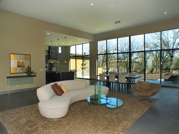 The home was designed to fit comfortably into the sloping land with broad, extended eaves while exposed concrete floors and simplified interior details offer a contemporary look without becoming cool and impersonal. The concrete floors also serve to absorb sunlight from the extensive south facing windows during the winter months to balance heat loss. By collaborating with the contractor from start to finish we were able to create a beautiful contemporary house at less than $200 a square foot.